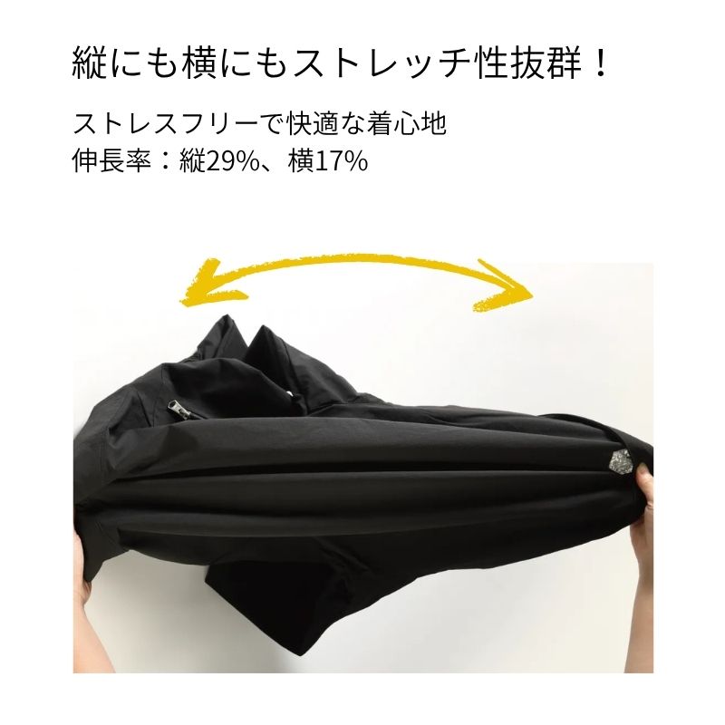 ストレッチ性を表す伸長率が縦29%、横17%で縦横ともに伸縮性があります。生地の軽さと相まってストレスフリーで快適な着心地です。