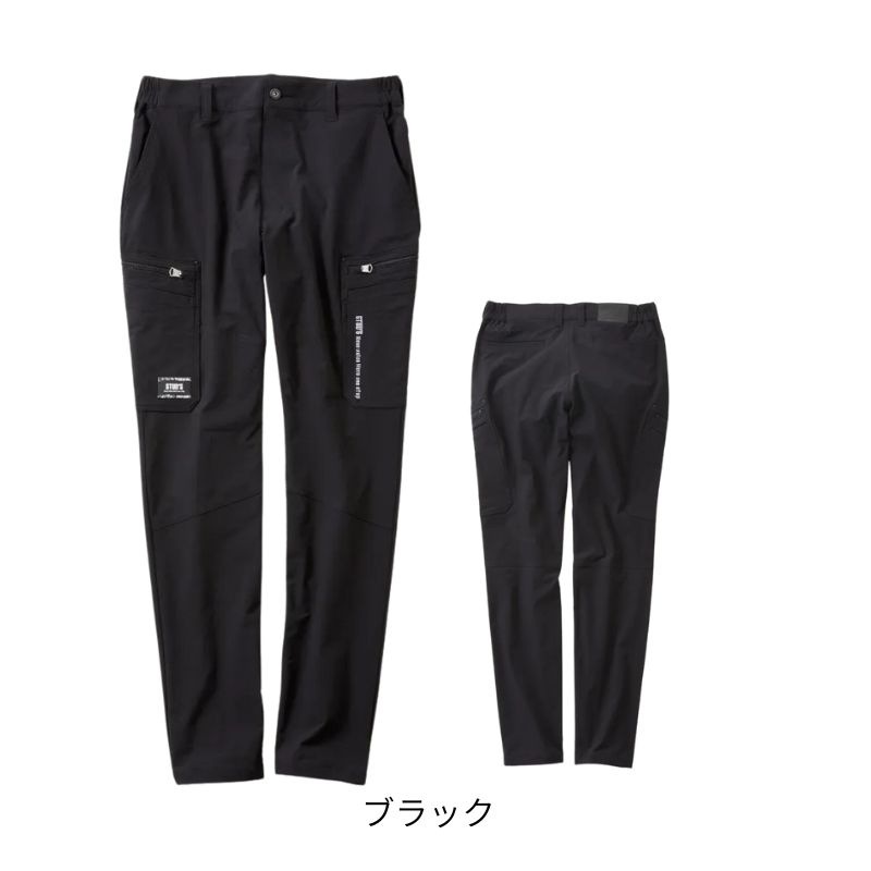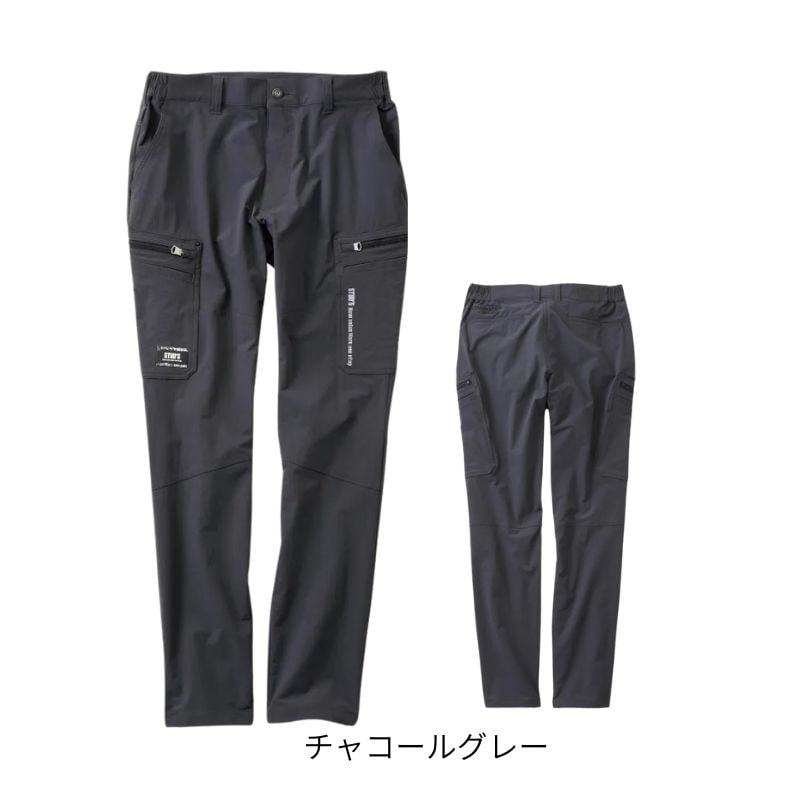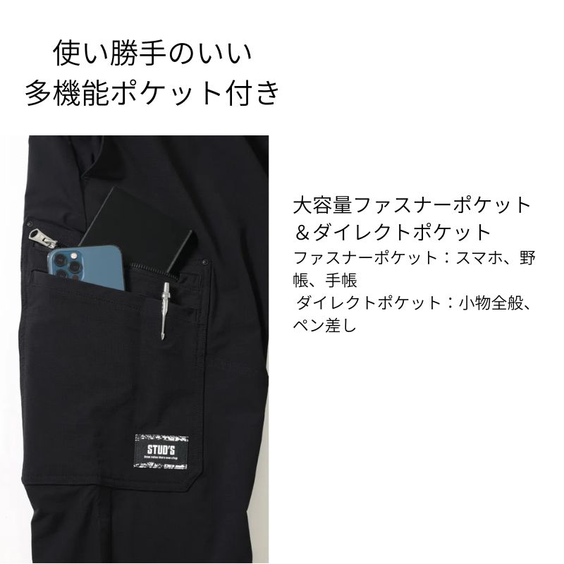 両脇に大容量のファスナーポケット+物の出し入れがしやすくペン差しとしても使える、フラップの無いダイレクトポケットを二重で配置しています。生地のストレッチ性に合わせたウエスト部分の脇ゴム仕様も快適です。