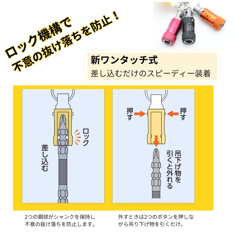 ワンタッチ式ビットホルダーは、どんなビットでも携帯できる便利なホルダーです。
