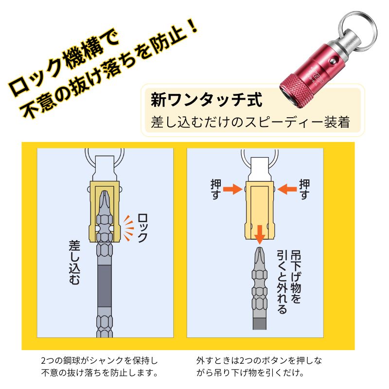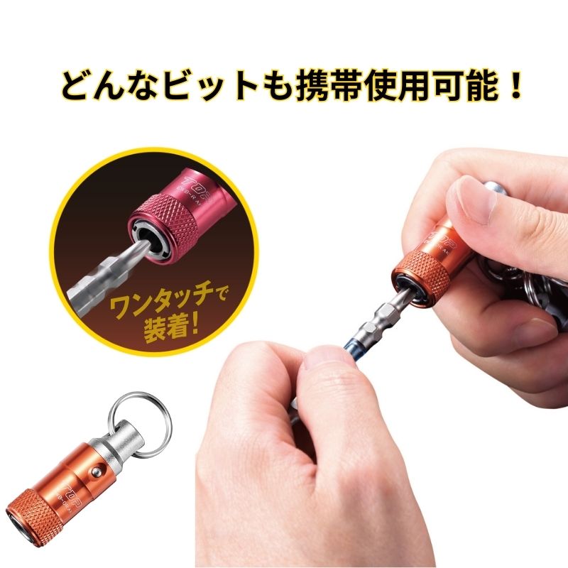 ワンタッチ式ビットホルダーは、どんなビットでも携帯できる便利なホルダーです。