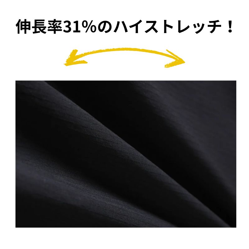 ストレッチ性を表す伸長率が横31%の高いストレッチに加え、軽量感も併せ持つ生地を使用しているのでストレスフリーな着心地を体感できます。