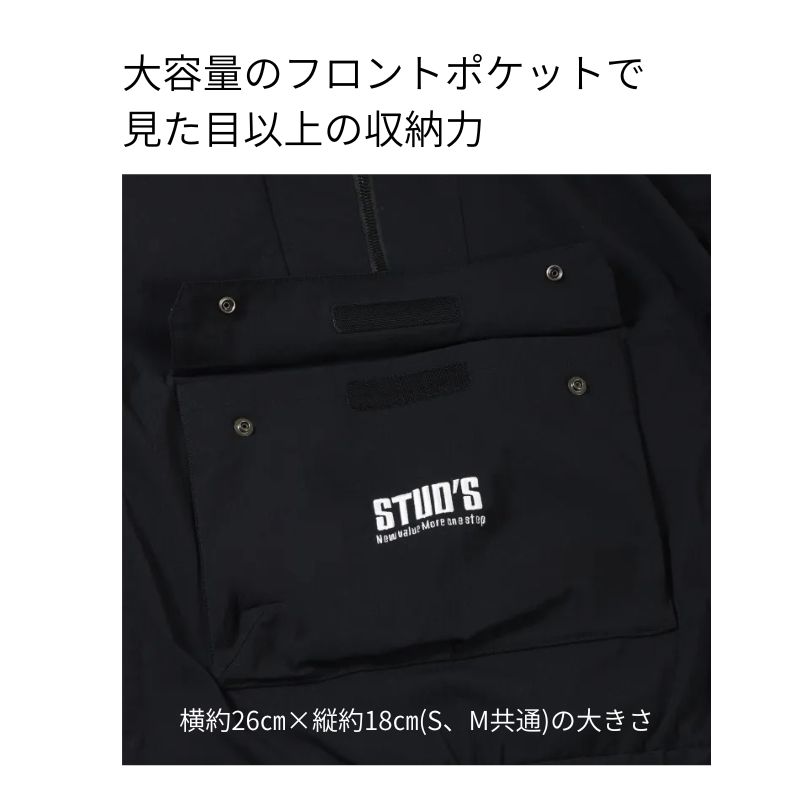 腹部のビッグポケット、両脇の大容量ファスナーポケット、右胸の切替えを利用したコンシールファスナーポケット、左袖のペン差しポケットと多くのポケットを搭載し様々なモノが収納できます。