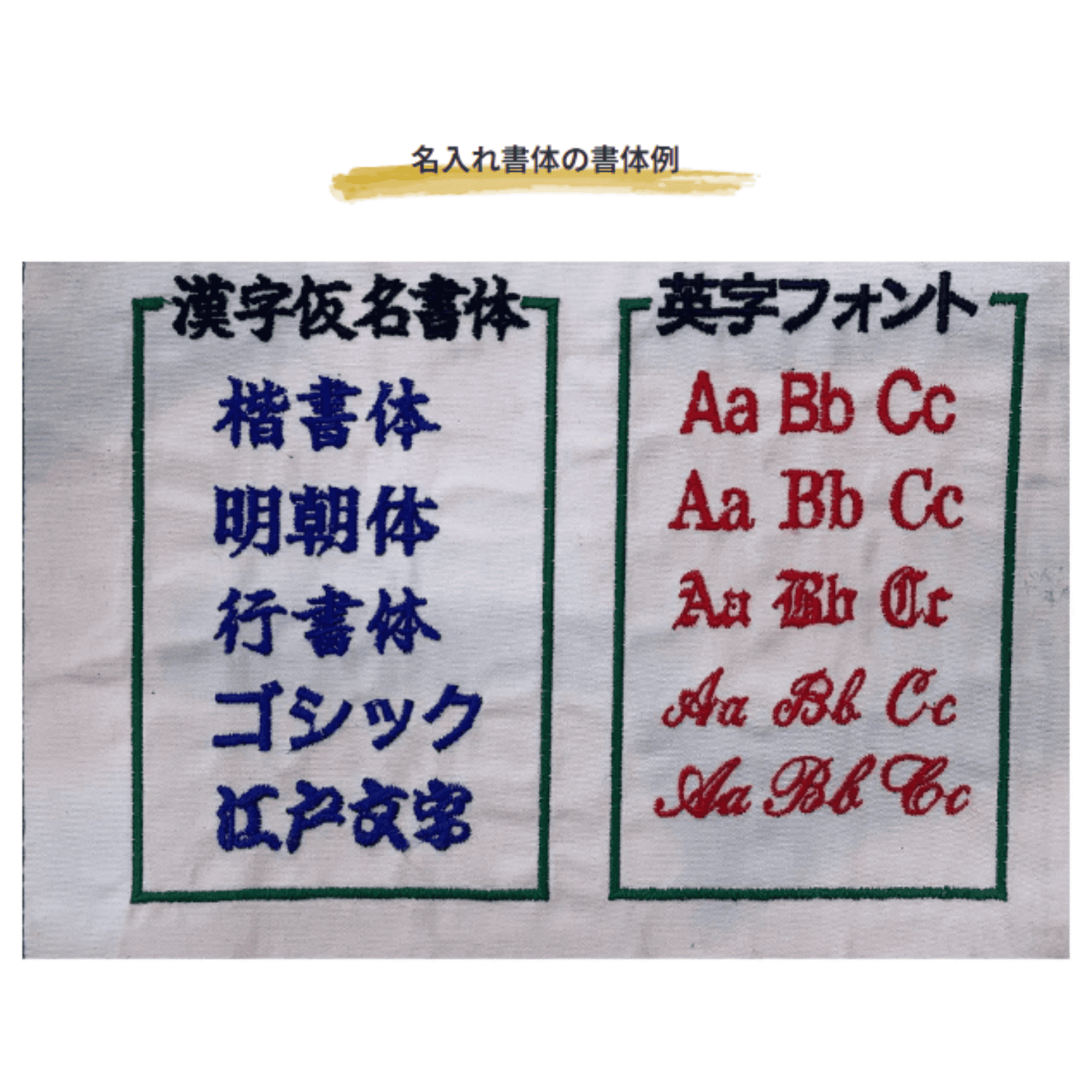 伝達メッセージ内または刺繍を行う商品の刺繍内容入力欄に文字、糸色、書体の指定をお願い致します。