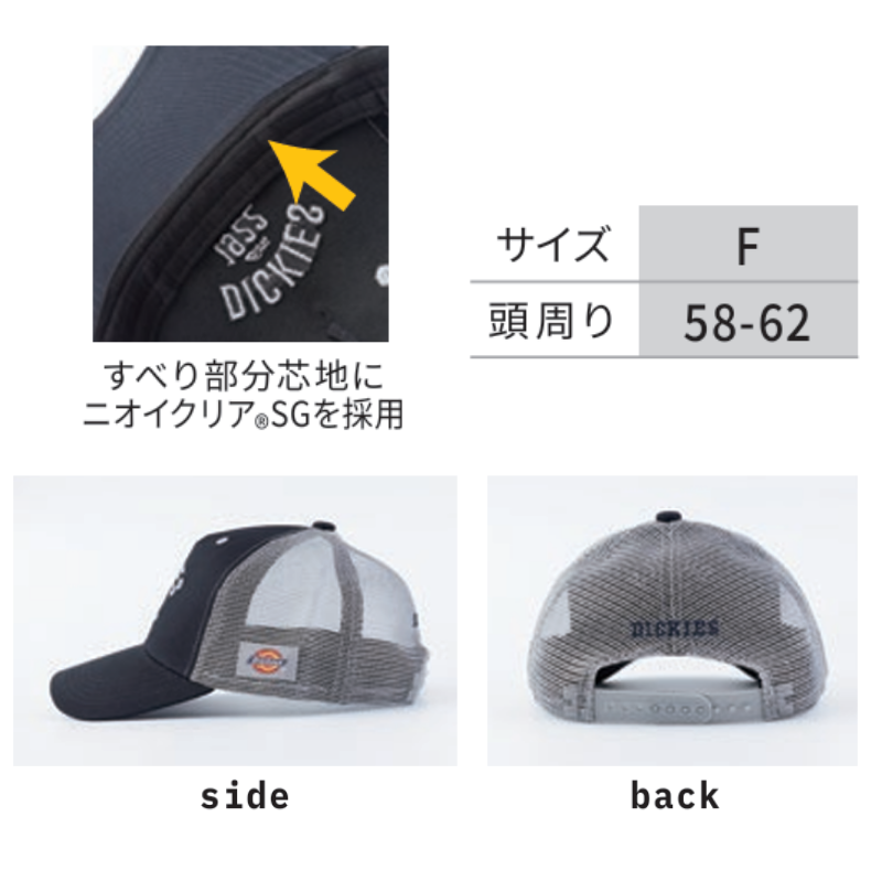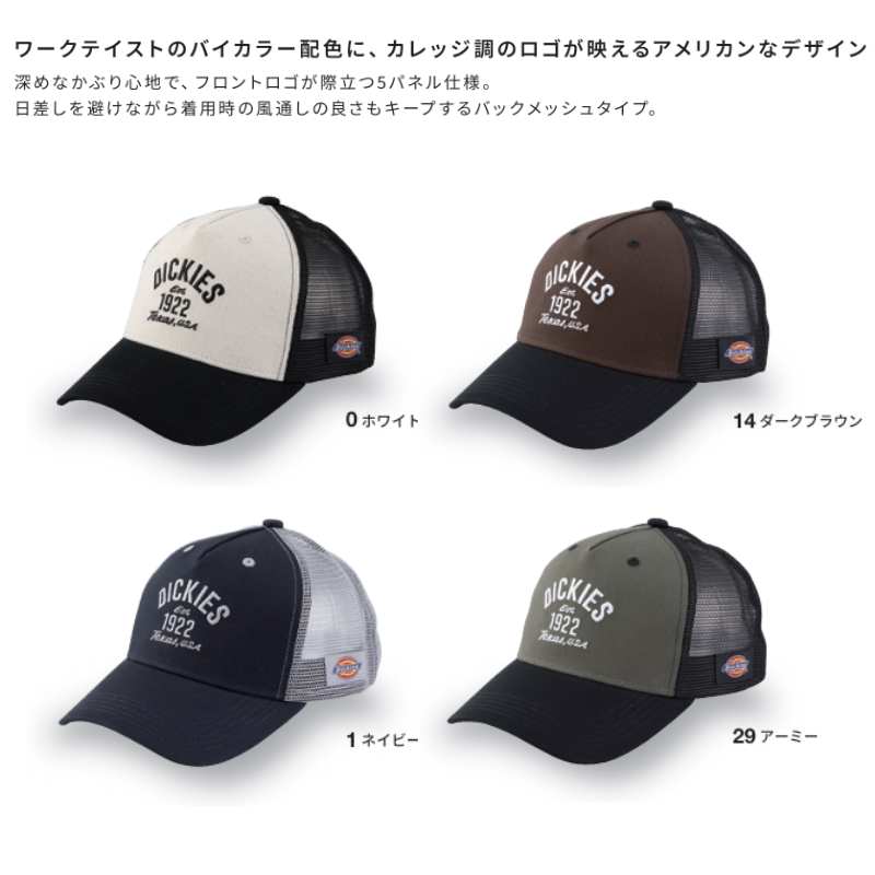 ワークテイストのバイカラー配色に、カレッジ調のロゴが映えるアメリカンなデザイン。深めなかぶり心地でフロントロゴが際立つ5パネル仕様。日差しを避けながら着用時の風通しの良さもキープするバックメッシュタイプ。