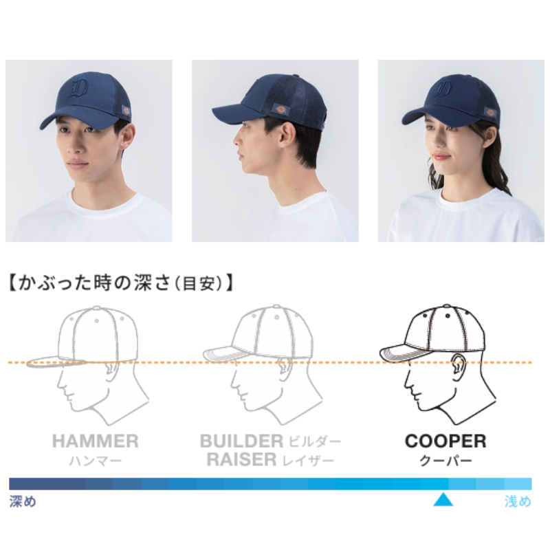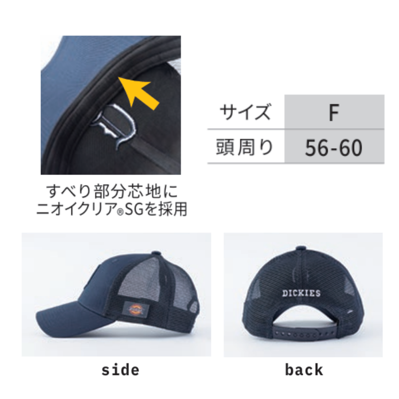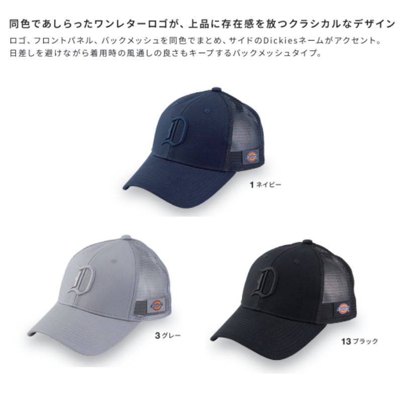 ロゴ、フロントパネル、バックメッシュを同色でまとめ、サイドのディッキーズネームがアクセント。